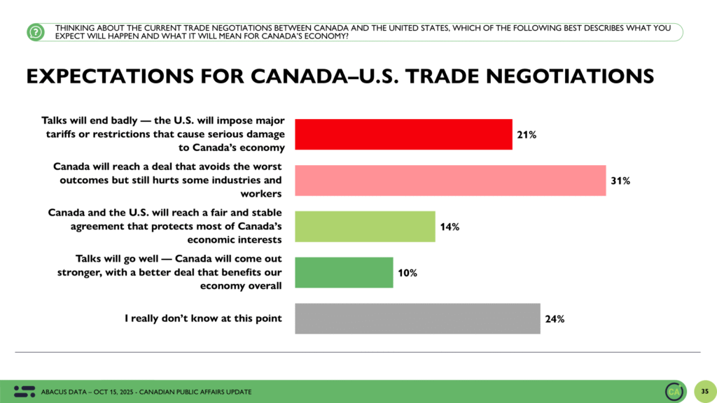 [David Coletto](https://abacusdata.ca/team/david-coletto/) October 31, 2025 With the 2025 federal budget set for November 4, new polling from **Abacus Data for the _[Toronto Star](https://www.thestar.com/politics/federal/mark-carney-is-pitching-austerity-but-canadians-want-something-else-poll-suggests/article_9f2c4e88-36c0-48a5-986c-ec91e36c3d39.html)_** finds Canadians approaching the budget in a pragmatic, almost weary frame of mind. Few see the deficit as an urgent crisis, and most want the government to steer a steady course, reducing […]
