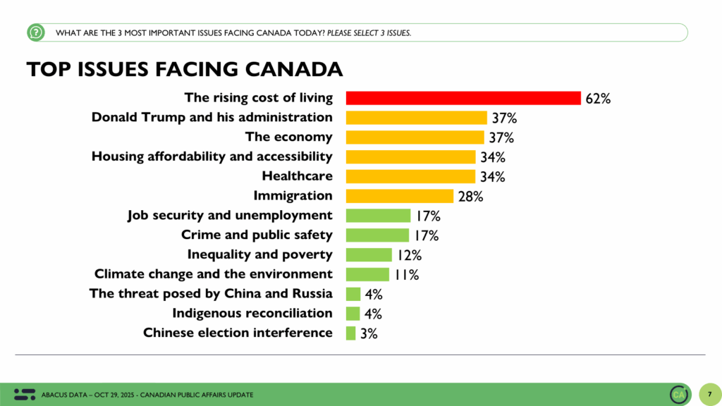 [David Coletto](https://abacusdata.ca/team/david-coletto/) October 19, 2025 Between October 9 and 15, 2025, Abacus Data surveyed 4,501 Canadian adults on the current state of federal politics. The findings show a landscape largely unchanged at the topline — a deadlocked race between the Liberals and Conservatives, steady impressions of Prime Minister Mark Carney, and consistent anxieties about cost […]