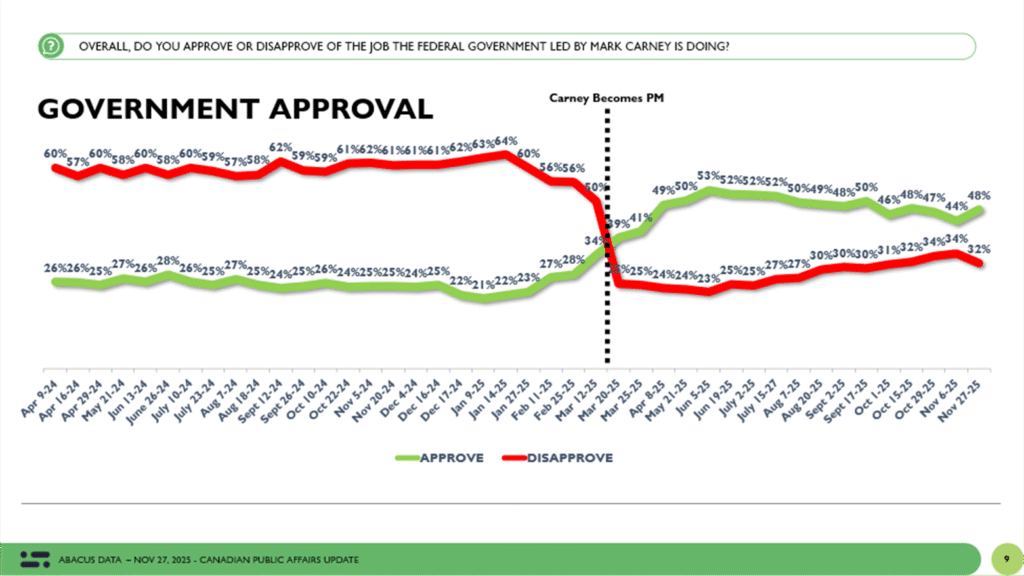 [David Coletto](https://abacusdata.ca/team/david-coletto/) November 30, 2025 Between November 20 and 27, 2025, Abacus Data surveyed 2,421 Canadian adults to assess the post-budget political landscape. The survey was conducted just days after the Carney government passed its budget and survived a confidence vote. The results suggest that while the budget slightly lifted Liberal support and improved impressions […]